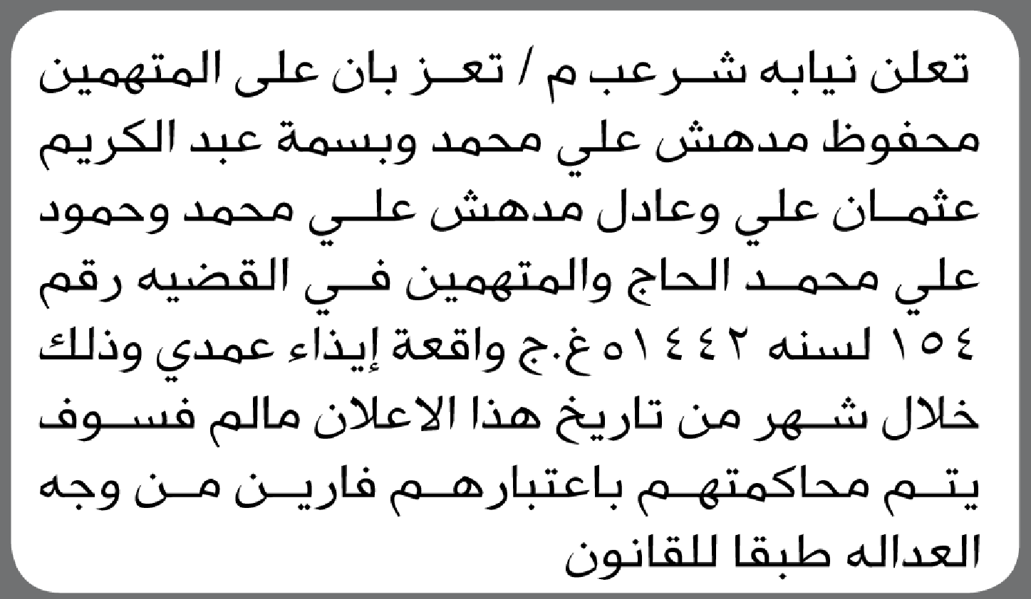 تعلن نيابة شرعب م/تعز بأن على المتهمين الحضور الى المحكمة إعلاناتمحاكم On نوفمبر 19, 2025 Share Share FacebookTwitterWhatsAppTelegramGoogle+البريد الإلكترونيPrint