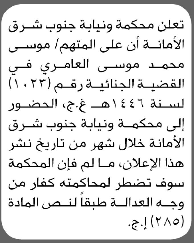 تعلن محكمة جنوب شرق الأمانة بأن على/ موسى محمد العامري الحضور إلى المحكمة إعلاناتمحاكم On نوفمبر 20, 2025 Share Share FacebookTwitterWhatsAppTelegramGoogle+البريد الإلكترونيPrint