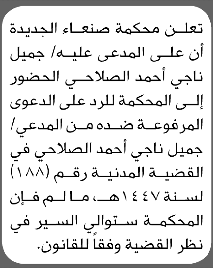 تعلن محكمة صنعاء الجديدة بأن على/ جميل ناجي الصلاحي الحضور إلى المحكمة إعلاناتمحاكم On نوفمبر 20, 2025 Share Share FacebookTwitterWhatsAppTelegramGoogle+البريد الإلكترونيPrint