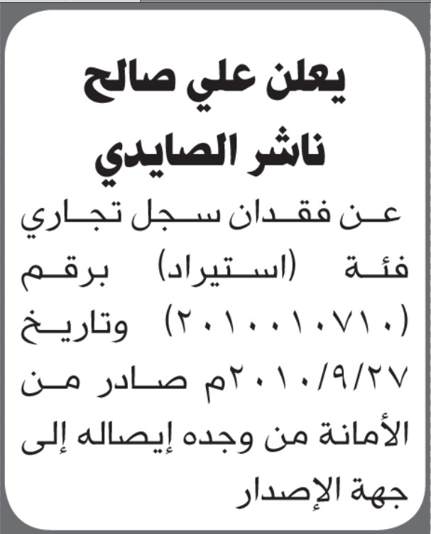 يعلن علي صالح الصايدي عن فقدان سجل تجاري إعلاناتفقدانات On نوفمبر 21, 2025 Share Share FacebookTwitterWhatsAppTelegramGoogle+البريد الإلكترونيPrint
