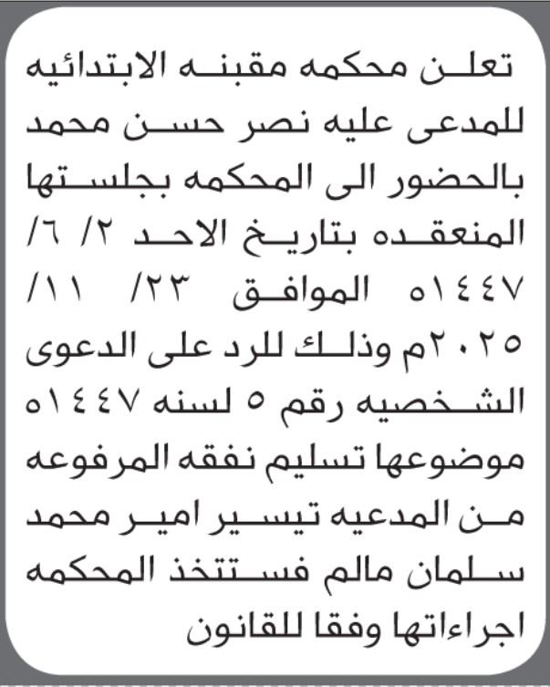 تعلن محكمة مقبنه بأن على المدعى عليه نصر محمد الحضور الى المحكمة إعلاناتمحاكم On نوفمبر 21, 2025 Share Share FacebookTwitterWhatsAppTelegramGoogle+البريد الإلكترونيPrint