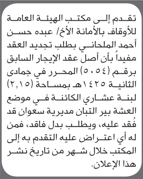 تقدم الى مكتب الأوقاف عبد الملحاني بطلب تجديد عقد إعلاناتمحاكم On نوفمبر 21, 2025 Share Share FacebookTwitterWhatsAppTelegramGoogle+البريد الإلكترونيPrint