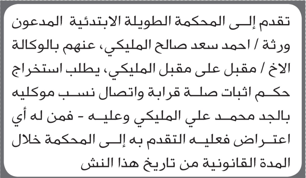 تعلن محكمة الطويلة أن الأخوة ورثة أحمد سعد المليكي تقدموا بطلب استخراج حكم اثبات صلة قرابة إعلاناتمحاكم On نوفمبر 21, 2025 Share Share FacebookTwitterWhatsAppTelegramGoogle+البريد الإلكترونيPrint