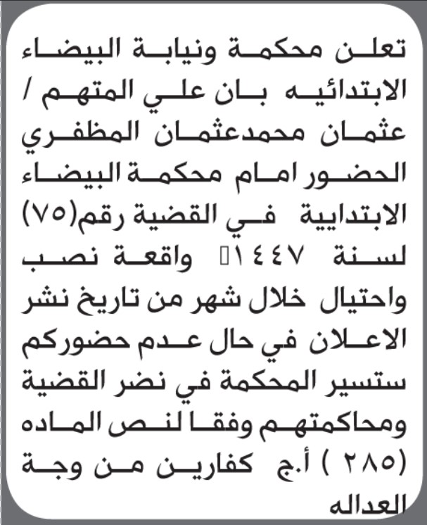 تعلن محكمة ونيابة البيضاء ان على المتهم عثمان المظفري الحضور إلى المحكمة إعلاناتمحاكم On نوفمبر 21, 2025 Share Share FacebookTwitterWhatsAppTelegramGoogle+البريد الإلكترونيPrint