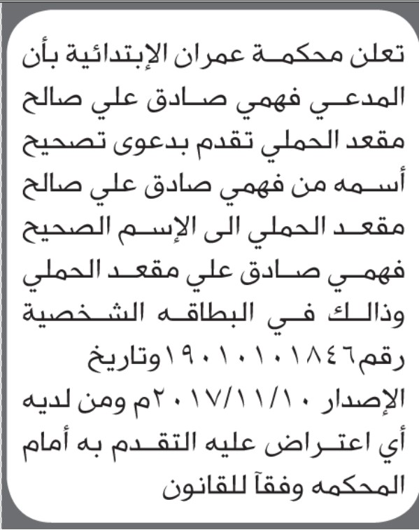 تقدم الى محكمة عمران الأخ فهمي الحملي بطلب تصحيح اسمه إعلاناتمحاكم On نوفمبر 21, 2025 Share Share FacebookTwitterWhatsAppTelegramGoogle+البريد الإلكترونيPrint