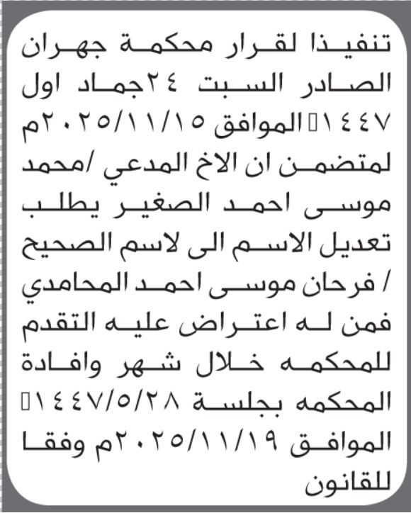 تعلن محكمة جهران أن الأخ محمد موسى الصغير تقدم بطلب تعديل اسمه إعلاناتمحاكم On نوفمبر 22, 2025 Share Share FacebookTwitterWhatsAppTelegramGoogle+البريد الإلكترونيPrint
