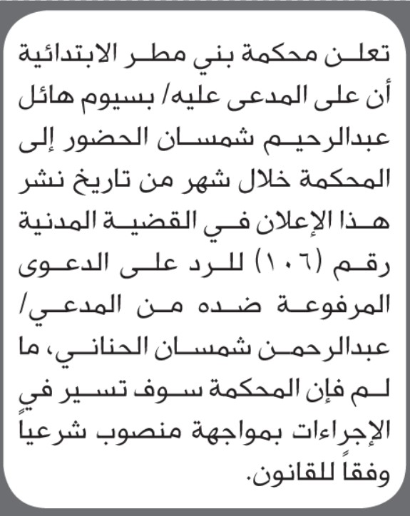 تعلن محكمة بني مطر الابتدائية بأن على/ بسيوم شمسان الحضور إلى المحكمة للرد على/ عبدالرحمن الحناني إعلاناتمحاكم On نوفمبر 23, 2025 Share Share FacebookTwitterWhatsAppTelegramGoogle+البريد الإلكترونيPrint
