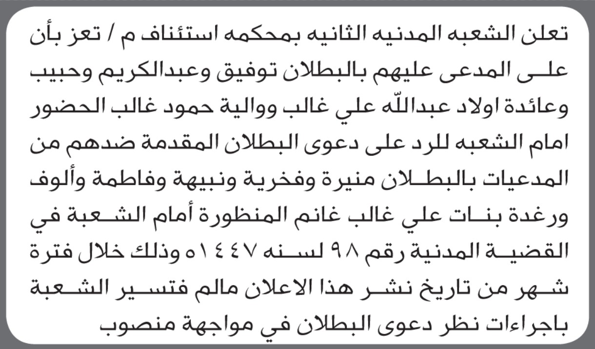 تعلن محكمة استئناف م/ تعز بأن على/ توفيق غالب وآخرين الحضور إلى المحكمة إعلاناتمحاكم On نوفمبر 23, 2025 Share Share FacebookTwitterWhatsAppTelegramGoogle+البريد الإلكترونيPrint