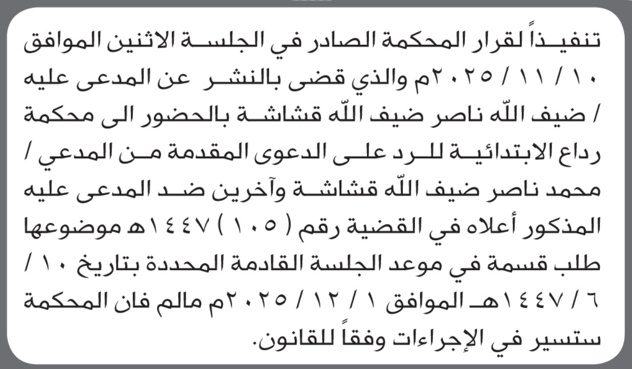 تعلن محكمة رداع الابتدائية بأن على/ ضيف الله ناصر قشاشة الحضور إلى المحكمة إعلاناتمحاكم On نوفمبر 23, 2025 Share Share FacebookTwitterWhatsAppTelegramGoogle+البريد الإلكترونيPrint