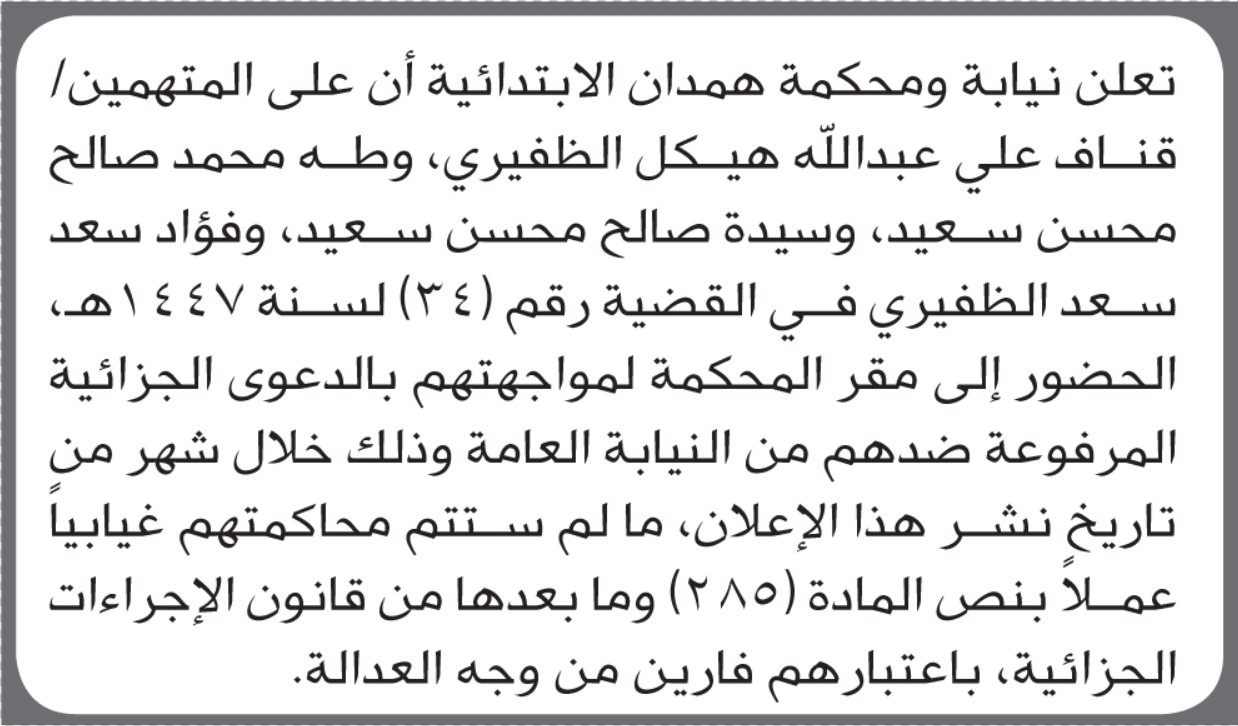 تعلن محكمة همدان الابتدائية بأن على/ قناف علي الظفيري وآخرين الحضور إلى المحكمة إعلاناتمحاكم On نوفمبر 23, 2025 Share Share FacebookTwitterWhatsAppTelegramGoogle+البريد الإلكترونيPrint
