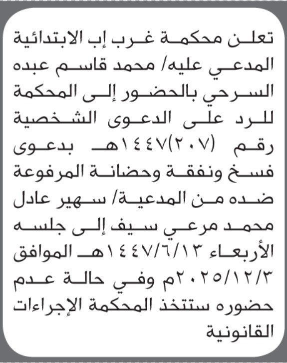 تعلن محكمة غرب إب أن على المدعى عليه محمد قاسم السرحي الحضور إلى المحكمة إعلاناتمحاكم On نوفمبر 23, 2025 Share Share FacebookTwitterWhatsAppTelegramGoogle+البريد الإلكترونيPrint