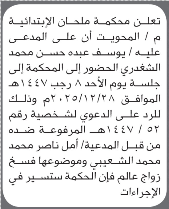 تعلن محكمة ملحان الابتدائية بأن على/ يوسف عبده الشغدري الحضور إلى المحكمة إعلاناتمحاكم On نوفمبر 24, 2025 Share Share FacebookTwitterWhatsAppTelegramGoogle+البريد الإلكترونيPrint