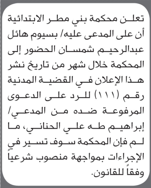 تعلن محكمة بني مطر الابتدائية بأن على/ بسيوم شمسان الحضور إلى المحكمة للرد على/ إبراهيم الحناني إعلاناتمحاكم On نوفمبر 24, 2025 Share Share FacebookTwitterWhatsAppTelegramGoogle+البريد الإلكترونيPrint