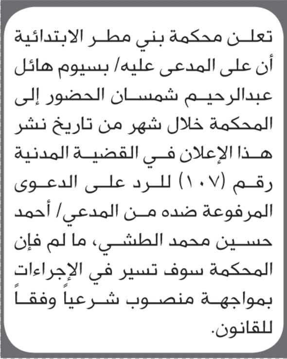 تعلن محكمة بني مطر الابتدائية بأن على/ بسيوم شمسان الحضور إلى المحكمة للرد على/ أحمد الطشي إعلاناتمحاكم On نوفمبر 24, 2025 Share Share FacebookTwitterWhatsAppTelegramGoogle+البريد الإلكترونيPrint