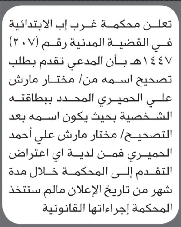 تعلن محكمة غرب إب الابتدائية بأن الأخ/ مختار مارش الحميري تقدم إليها بطلب تصحيح اسمه إعلاناتمحاكم On نوفمبر 24, 2025 Share Share FacebookTwitterWhatsAppTelegramGoogle+البريد الإلكترونيPrint