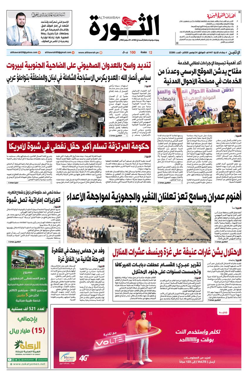 الصحيفة الورقية صحيفة الثورة الاثنين 4 جمادى الاخرى 1447 – 24 نوفمبر 2025 On نوفمبر 24, 2025 Share View Fullscreen Share FacebookTwitterWhatsAppTelegramGoogle+البريد الإلكترونيPrint