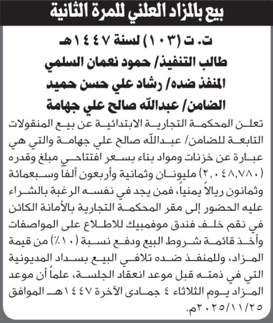 تعلن المحكمة التجارية بالأمانة عن بيع المنقولات التابعة للضامن عن المنفذ ضده رشاد حميد إعلاناتمحاكم On نوفمبر 24, 2025 Share Share FacebookTwitterWhatsAppTelegramGoogle+البريد الإلكترونيPrint