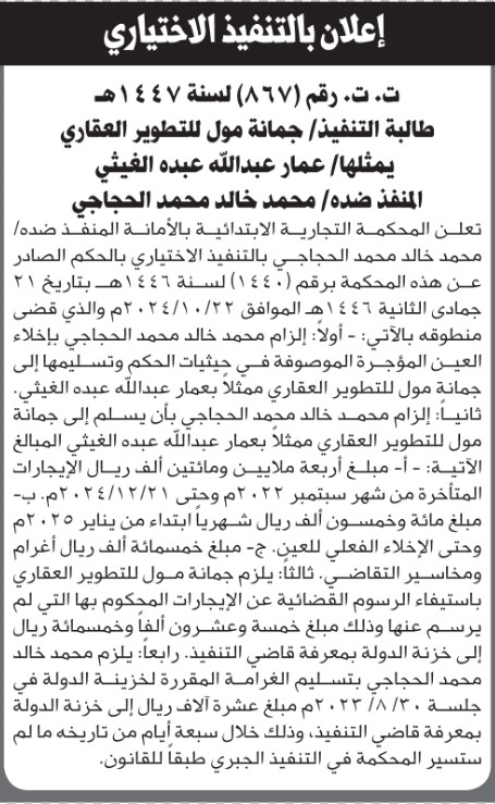 تعلن المحكمة التجارية بالأمانة للمنفذ ضده محمد خالد الحجاجي بالتفنيذ الاختياري للحكم إعلاناتمحاكم On نوفمبر 24, 2025 Share Share FacebookTwitterWhatsAppTelegramGoogle+البريد الإلكترونيPrint