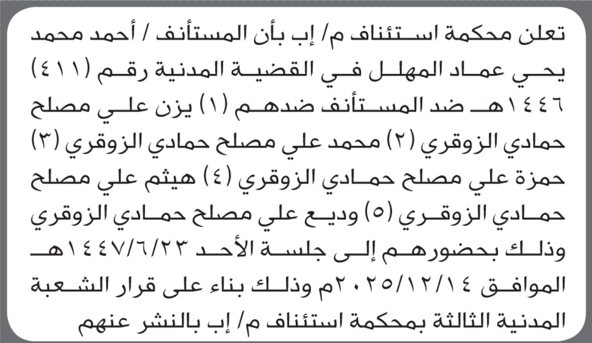 تعلن محكمة استئناف م إب أن على المستأنف ضدهم يزن الزوقري وآخرين الحضور إلى المحكمة إعلاناتمحاكم On نوفمبر 24, 2025 Share Share FacebookTwitterWhatsAppTelegramGoogle+البريد الإلكترونيPrint