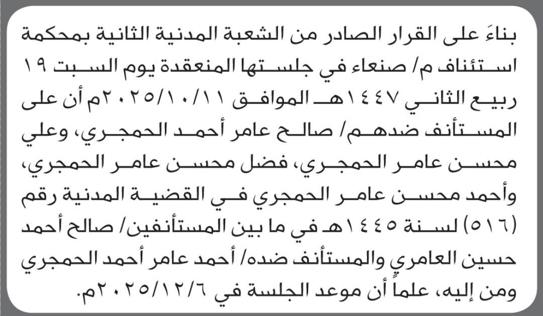 تعلن محكمة استئناف م صنعاء أن على المستأنف ضدهم صالح الحمجري وآخرين الحضور إلى المحكمة إعلاناتمحاكم On نوفمبر 24, 2025 Share Share FacebookTwitterWhatsAppTelegramGoogle+البريد الإلكترونيPrint