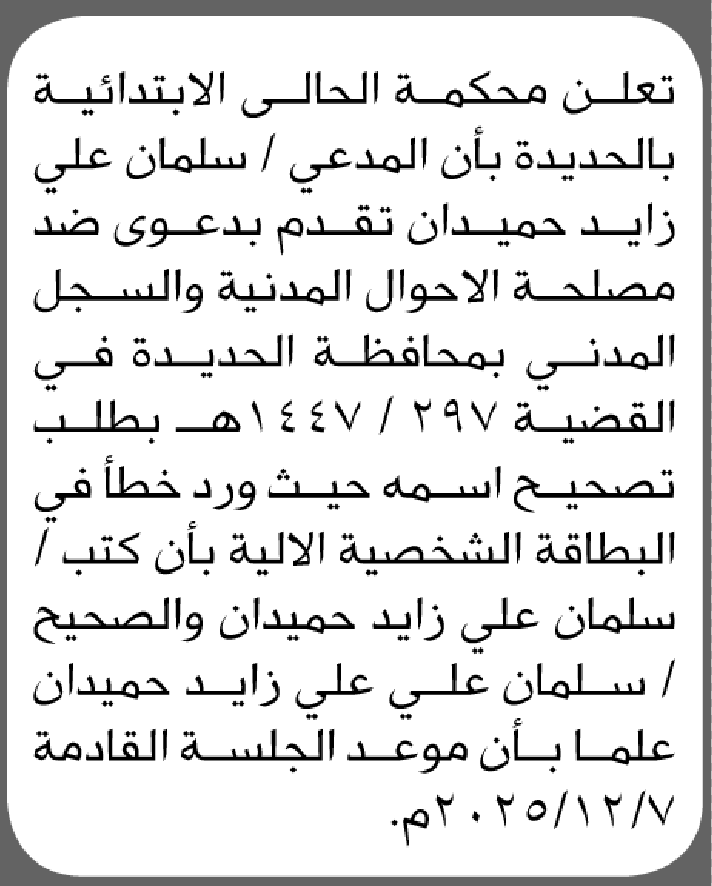 تعلن محكمة الحالي أن الأخ سلمان علي زايد تقدم بطلب تصحيح اسمه إعلاناتمحاكم On نوفمبر 25, 2025 Share Share FacebookTwitterWhatsAppTelegramGoogle+البريد الإلكترونيPrint