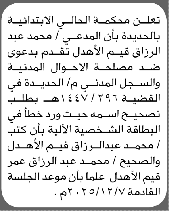 تعلن محكمة الحالي أن الأخ محمد عبدالرزاق الأهدل تقدم بطلب تصحيح اسمه إعلاناتمحاكم On نوفمبر 25, 2025 Share Share FacebookTwitterWhatsAppTelegramGoogle+البريد الإلكترونيPrint