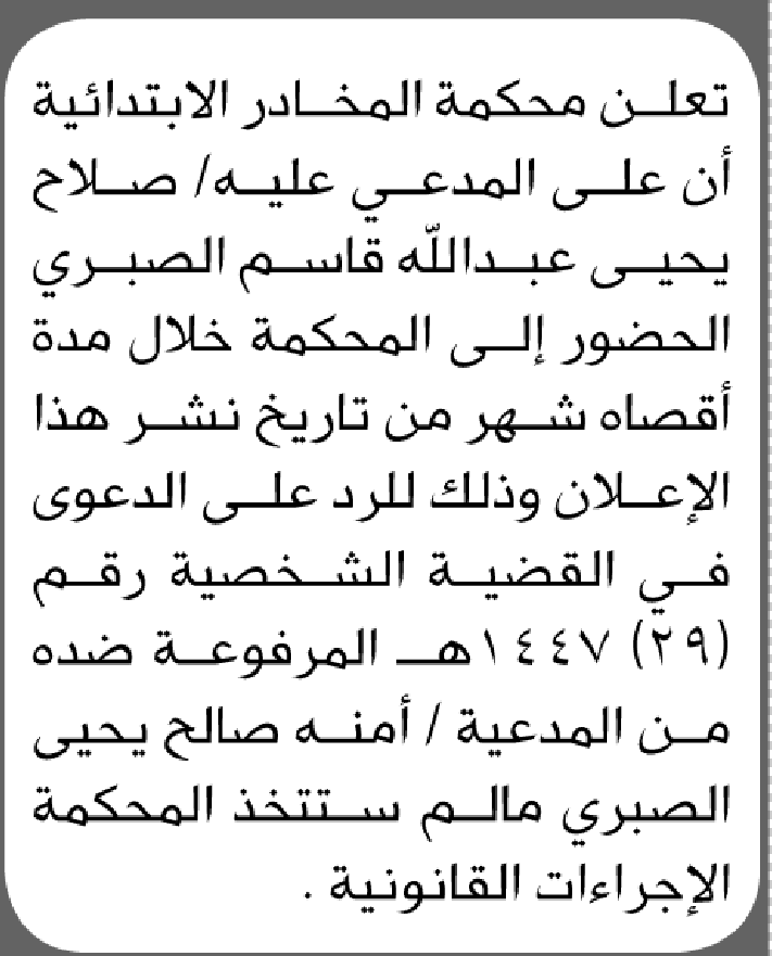 تعلن محكمة المخادر أن على المدعى عليه صلاح يحيى الصبري الحضور إلى المحكمة إعلاناتمحاكم On نوفمبر 25, 2025 Share Share FacebookTwitterWhatsAppTelegramGoogle+البريد الإلكترونيPrint