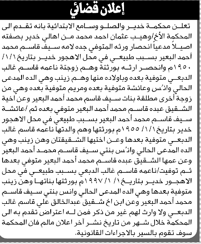 تعلن محكمة خدير والصلو وسامع أن الأخ وهيب عثمان أحمد تقدم بدعوى انحصار وراثة إعلاناتمحاكم On نوفمبر 25, 2025 Share Share FacebookTwitterWhatsAppTelegramGoogle+البريد الإلكترونيPrint