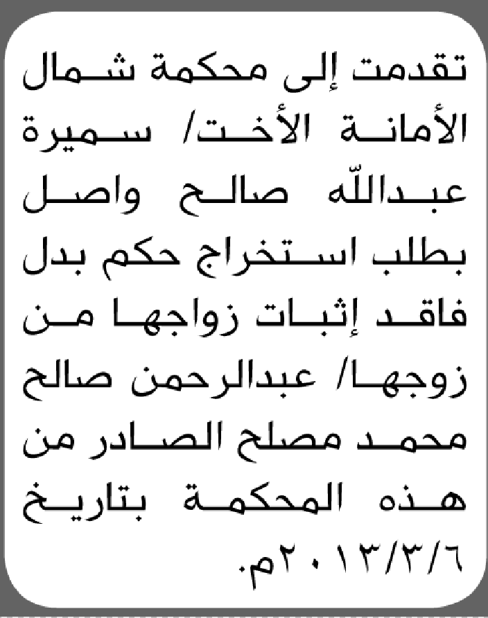 تعلن محكمة شمال الأمانة بأن الأخت/ سميرة عبدالله واصل تقدمت إليها بطلب استخراج حكم بدل فاقد إعلاناتمحاكم On نوفمبر 25, 2025 Share Share FacebookTwitterWhatsAppTelegramGoogle+البريد الإلكترونيPrint