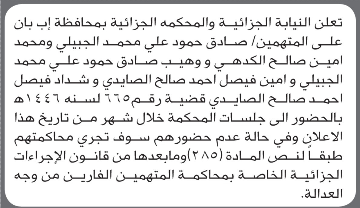 تعلن النيابة والمحكمة الجزائية بمحافظة إب للمتهمين صادق الجبيلي وآخرين بالحضور إلى المحكمة إعلاناتمحاكم On نوفمبر 26, 2025 Share Share FacebookTwitterWhatsAppTelegramGoogle+البريد الإلكترونيPrint