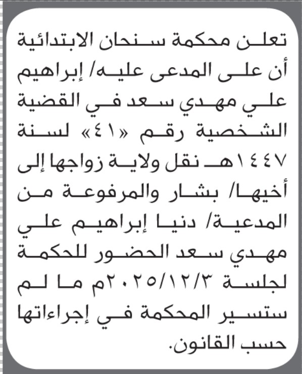 تعلن محكمة سنحان الابتدائية بأن على/ إبراهيم علي سعد الحضور إلى المحكمة إعلاناتمحاكم On نوفمبر 26, 2025 Share Share FacebookTwitterWhatsAppTelegramGoogle+البريد الإلكترونيPrint