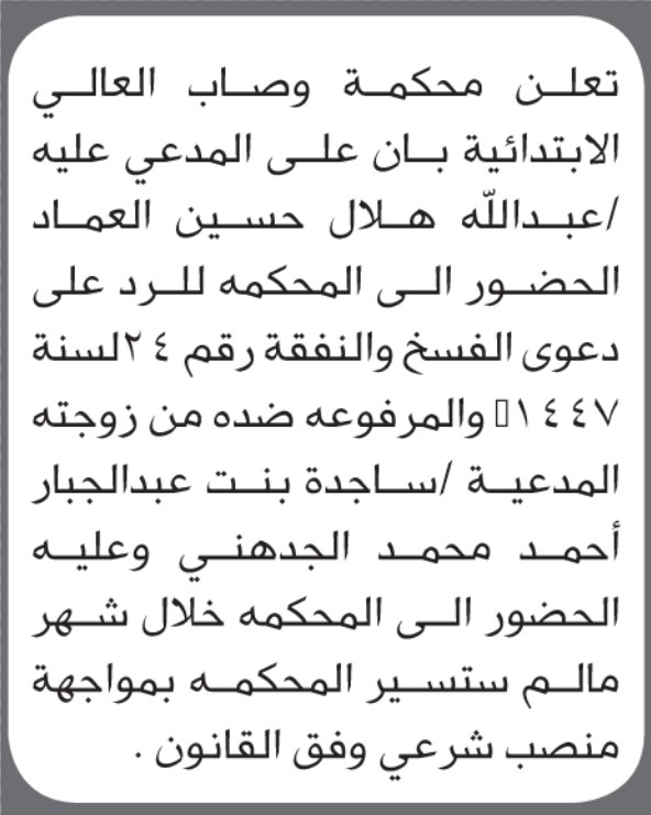 تعلن محكمة وصاب العالي الابتدائية بأن على/ عبدالله هلال العماد الحضور إلى المحكمة إعلاناتمحاكم On نوفمبر 26, 2025 Share Share FacebookTwitterWhatsAppTelegramGoogle+البريد الإلكترونيPrint