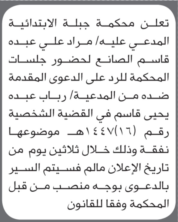 تعلن محكمة جبلة الابتدائية بأن على/ مراد علي الصانع الحضور إلى المحكمة إعلاناتمحاكم On نوفمبر 26, 2025 Share Share FacebookTwitterWhatsAppTelegramGoogle+البريد الإلكترونيPrint