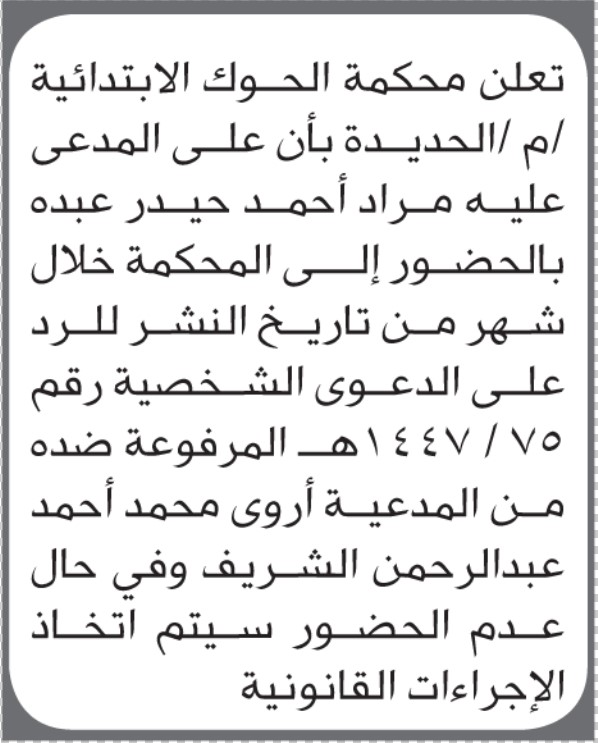 تعلن محكمة الحوك الابتدائية بأن على/ مراد أحمد عبده الحضور إلى المحكمة إعلاناتمحاكم On نوفمبر 26, 2025 Share Share FacebookTwitterWhatsAppTelegramGoogle+البريد الإلكترونيPrint
