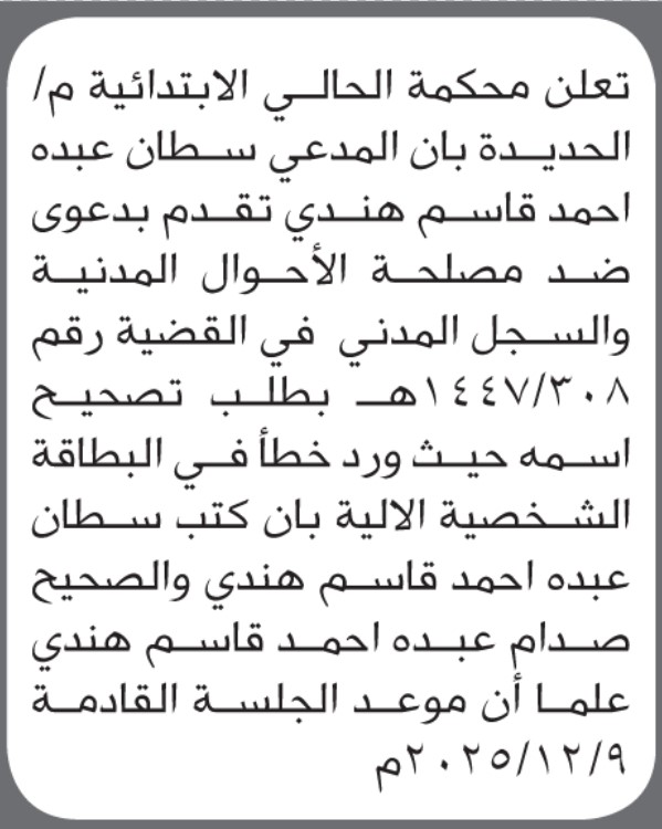 تعلن محكمة الحالي أن الأخ سلطان عبده هندي تقدم بطلب تصحيح اسمه إعلاناتمحاكم On نوفمبر 27, 2025 Share Share FacebookTwitterWhatsAppTelegramGoogle+البريد الإلكترونيPrint