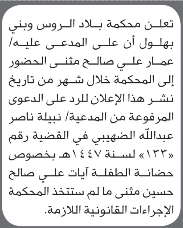 تعلن محكمة بلاد الروس وبني بهلول بأن على/ عمار علي مثنى الحضور إلى المحكمة إعلاناتمحاكم On نوفمبر 27, 2025 Share Share FacebookTwitterWhatsAppTelegramGoogle+البريد الإلكترونيPrint