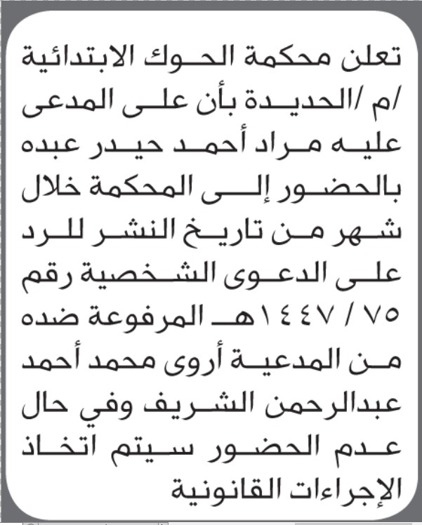 تعلن محكمة الحوك الابتدائية بأن على/ مراد أحمد عبده الحضور إلى المحكمة إعلاناتمحاكم On نوفمبر 27, 2025 Share Share FacebookTwitterWhatsAppTelegramGoogle+البريد الإلكترونيPrint