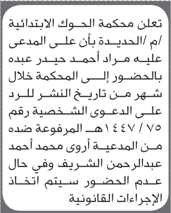 تعلن محكمة الحوك أن على المدعى عليه مراد أحمد حيدر الحضور إلى المحكمة إعلاناتمحاكم On نوفمبر 28, 2025 Share Share FacebookTwitterWhatsAppTelegramGoogle+البريد الإلكترونيPrint