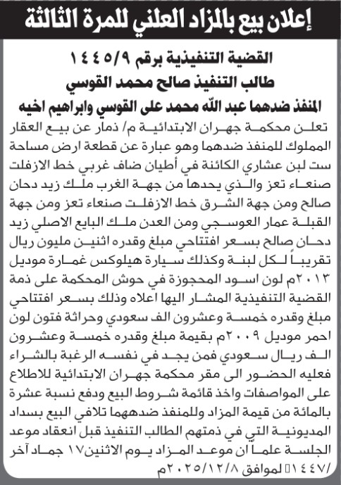تعلن محكمة جهران عن بيع العقار التابع للمنفذ ضدهما عبدالله وإبراهيم القوسي إعلاناتمحاكم On نوفمبر 28, 2025 Share Share FacebookTwitterWhatsAppTelegramGoogle+البريد الإلكترونيPrint