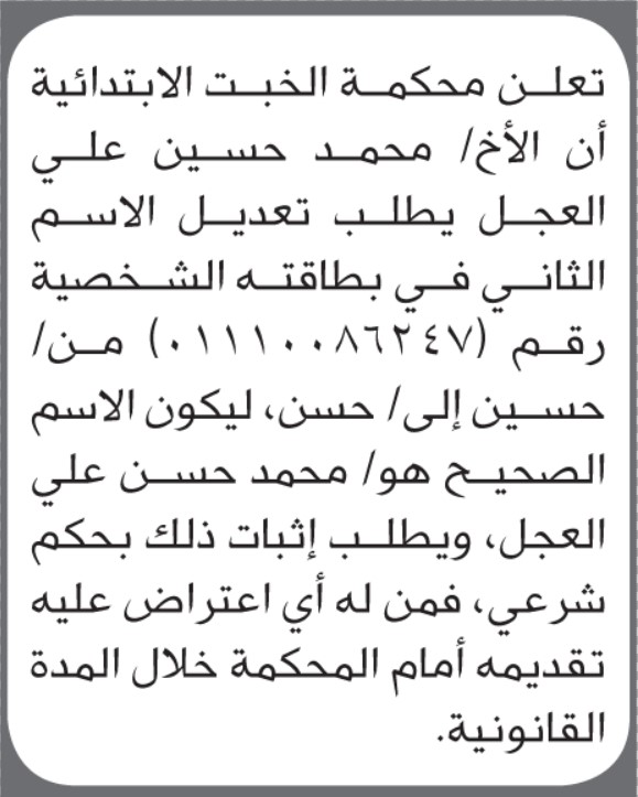 تعلن محكمة الخبت أن محمد العجل تقدم بطلب تعديل اسم إعلاناتمحاكم On نوفمبر 27, 2025 Share Share FacebookTwitterWhatsAppTelegramGoogle+البريد الإلكترونيPrint