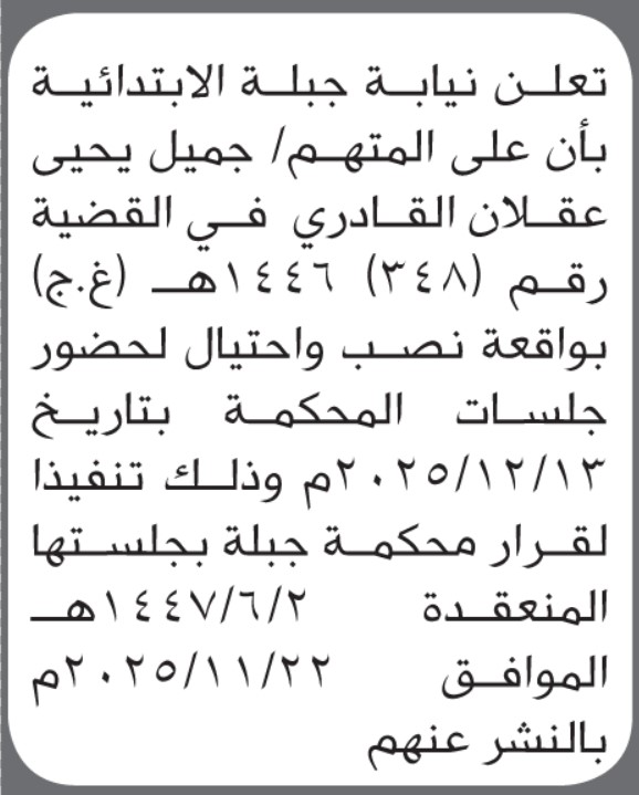 تعلن نيابة ومحكمة جبلة أن على المتهم جميل القادري الحضور الى المحكمة إعلاناتمحاكم On نوفمبر 27, 2025 Share Share FacebookTwitterWhatsAppTelegramGoogle+البريد الإلكترونيPrint