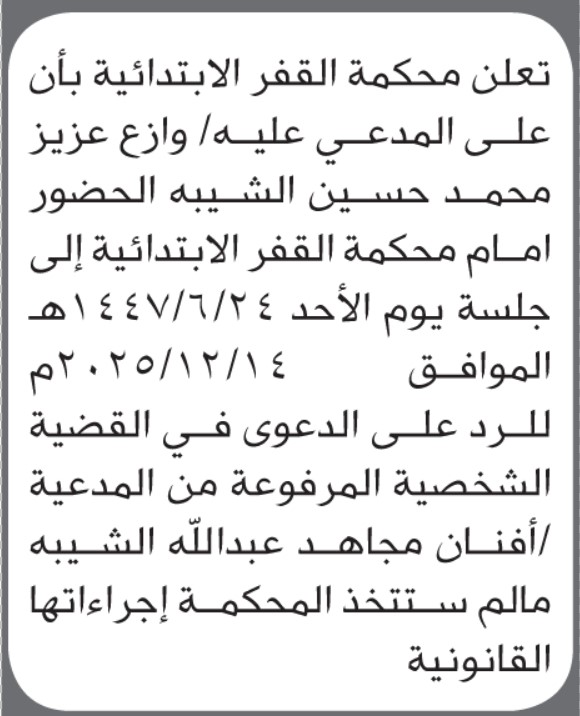 تعلن محكمة القفر أن على المدعى عليه وازع الشيبه الحضور الى المحكمة إعلاناتمحاكم On نوفمبر 27, 2025 Share Share FacebookTwitterWhatsAppTelegramGoogle+البريد الإلكترونيPrint