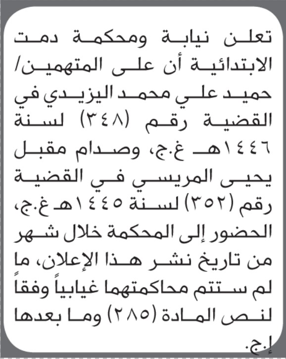 تعلن نيابة ومحكمة دمت ان على المتهمين الحضور الى المحكمة إعلاناتمحاكم On نوفمبر 27, 2025 Share Share FacebookTwitterWhatsAppTelegramGoogle+البريد الإلكترونيPrint
