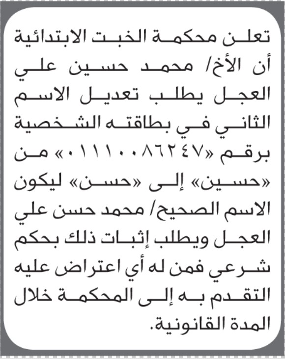 تعلن محكمة الخبت الابتدائية بأن الأخ/ محمد حسين العجل تقدم إليها بطلب تعديل اسمه إعلاناتمحاكم On نوفمبر 28, 2025 Share Share FacebookTwitterWhatsAppTelegramGoogle+البريد الإلكترونيPrint