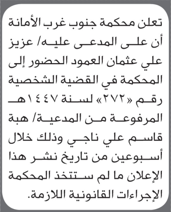 تعلن محكمة جنوب غرب الأمانة بأن على/ عزيز علي العمود الحضور إلى المحكمة إعلاناتمحاكم On نوفمبر 28, 2025 Share Share FacebookTwitterWhatsAppTelegramGoogle+البريد الإلكترونيPrint