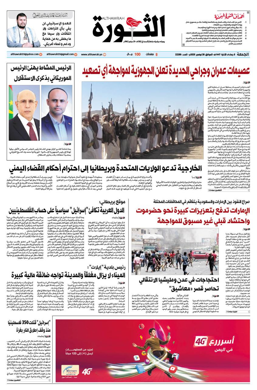 الصحيفة الورقية صحيفة الثورة الجمعة 08 جمادى الاخرة 1447 – 28 نوفمبر 2025 On نوفمبر 27, 2025 Share View Fullscreen Share FacebookTwitterWhatsAppTelegramGoogle+البريد الإلكترونيPrint