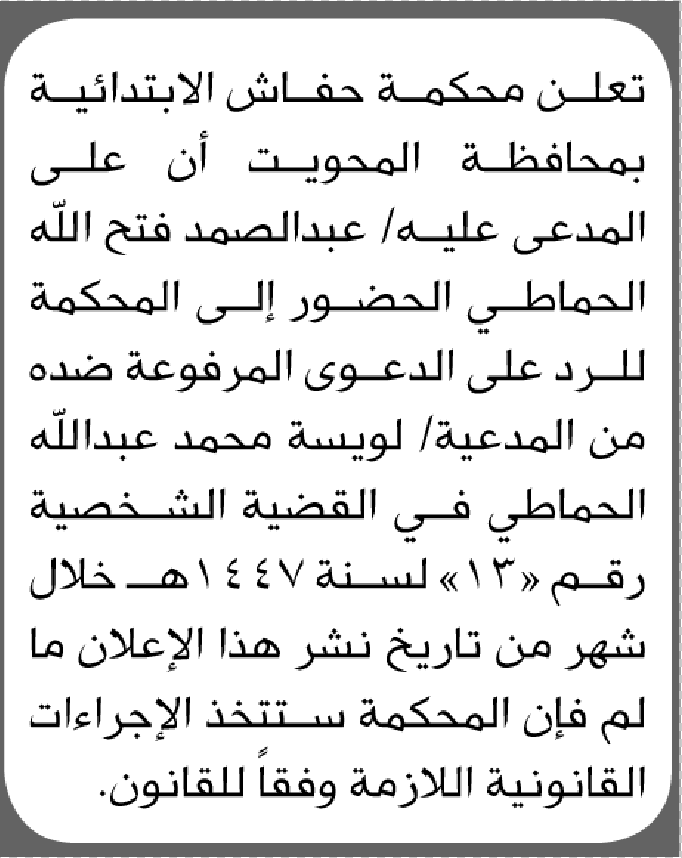 تعلن محكمة حفاش م/المحويت أن على المدعى عليه عبدالصمد الحماطي الحضور الى المحكمة إعلاناتمحاكم On نوفمبر 29, 2025 Share Share FacebookTwitterWhatsAppTelegramGoogle+البريد الإلكترونيPrint