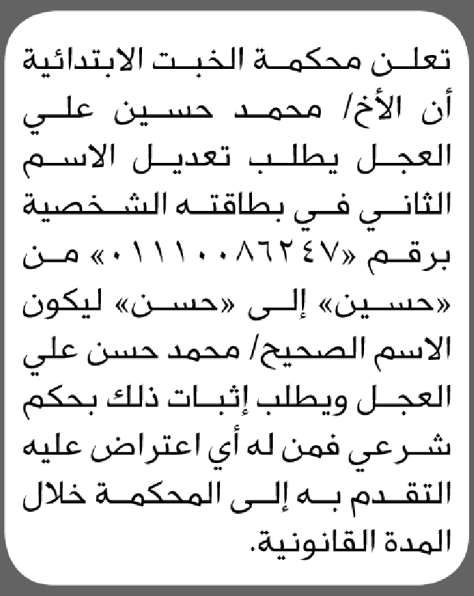 تعلن محكمة الخبت أن محمد العجل تقدم بطلب تعديل اسم إعلاناتمحاكم On نوفمبر 29, 2025 Share Share FacebookTwitterWhatsAppTelegramGoogle+البريد الإلكترونيPrint