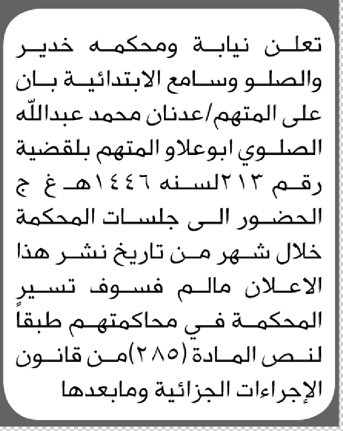 تعلن محكمة خدير والصلو وسامع أن على المتهم عدنان الصلوي الحضور الى المحكمة إعلاناتمحاكم On نوفمبر 29, 2025 Share Share FacebookTwitterWhatsAppTelegramGoogle+البريد الإلكترونيPrint