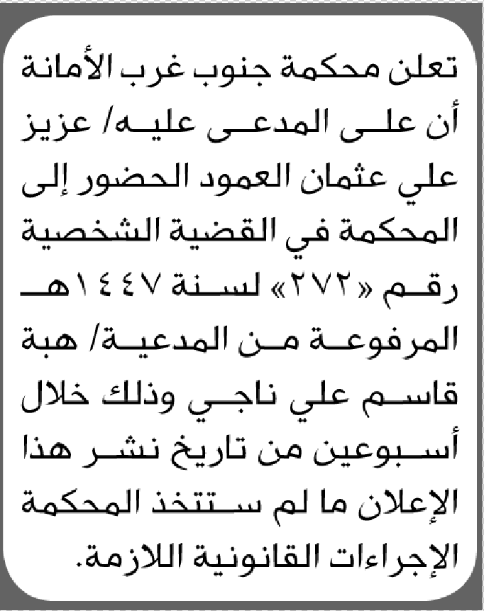 تعلن محكمة جنوب غرب الامانة أن على المدعى عليه عزيز العمود الحضور الى المحكمة إعلاناتمحاكم On نوفمبر 29, 2025 Share Share FacebookTwitterWhatsAppTelegramGoogle+البريد الإلكترونيPrint